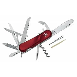 Ein umfangreiches Schweizer Messer für Junioren. Zu der 10-teiligen Ausstattung gehören Säge, Schere, Büchsenöffner und Korkenzieher. Die Klinge ist an der Spitze abgerundet und wird nach dem Öffnen arretiert. Zusammen mit den ergonomischen Evolution-Scha